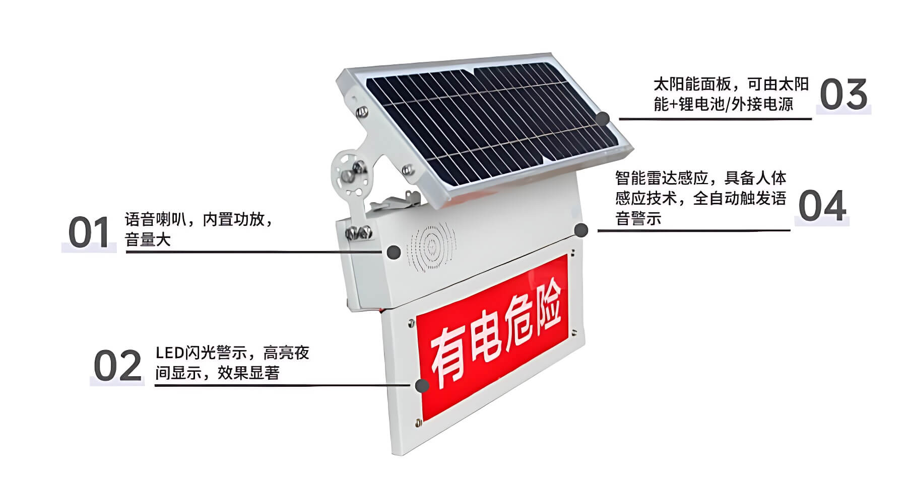 防外力破壞智能語音警示牌采用太陽能供電并給備用鋰電池充電,太陽能功率不足時,轉(zhuǎn)由備用電池供電,當(dāng)行人接近警示牌時,智能雷達(dá)感應(yīng)模塊立即動作,并通過控制系統(tǒng)智能聯(lián)動語音警示單元,啟動語音播報(bào)和LED警示燈爆閃,提醒行人、作業(yè)車輛等注意保持安全距離;智能雷達(dá)感應(yīng)模塊未動作時,也可設(shè)定固定時間間隔自動播放語音和LED警示燈閃爍以警示在附近活動的人員或作業(yè)車輛。