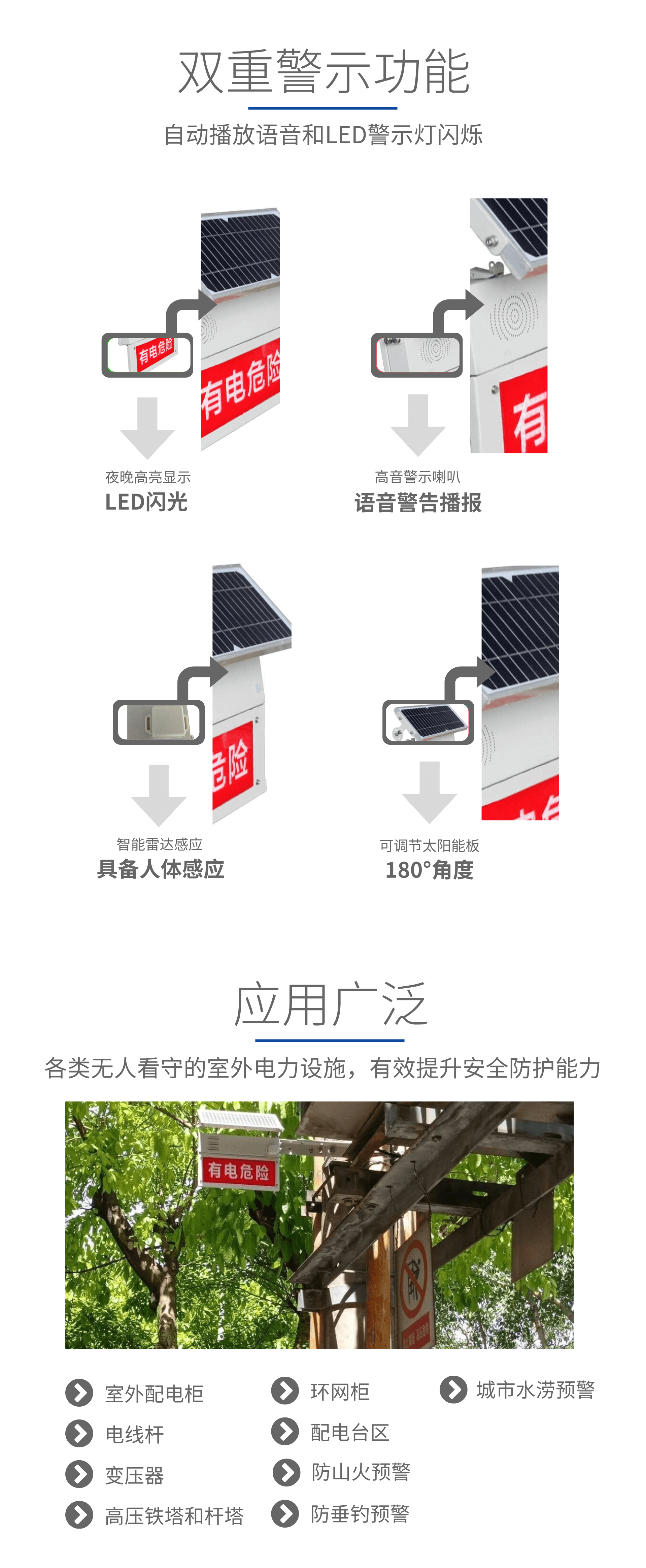 隨著人們對電力的依賴性越來越強(qiáng),電力設(shè)施越來越多,被誤撞帶來危險的次數(shù)也不斷增加。目前,現(xiàn)有的室外供電設(shè)備如變壓器、電線桿、配電柜等都是無人看守的,為防止閑雜人員觸電,一般都是采用加裝護(hù)欄、圍欄等隔離措施,或常掛一塊“高壓危險,行人止步”的標(biāo)識牌,這種標(biāo)識牌日久天長極易失落,夜間又不易被發(fā)現(xiàn),因而起不到良好的警示作用,且對一些兒童或不懂電的人員往往起不到安全防護(hù)作用。