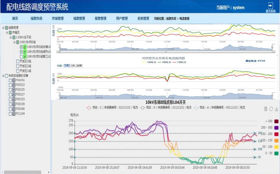 導(dǎo)線負(fù)荷溫升監(jiān)測系統(tǒng)綜合運(yùn)用了太陽能取電、無線通信及信息網(wǎng)絡(luò)等現(xiàn)代科學(xué)新技術(shù)。能實(shí)時(shí)準(zhǔn)確地在線監(jiān)測線路狀態(tài),并將所采集到的負(fù)荷及溫度等信息發(fā)送回主站中心;主站對信息進(jìn)行數(shù)據(jù)統(tǒng)計(jì)、分析、拓?fù)溆?jì)算,確定負(fù)荷溫升狀態(tài),從而引導(dǎo)工作人員定位隱患。為提高相關(guān)工作人員的效率、減輕勞動(dòng)強(qiáng)度提供了一種強(qiáng)有力的手段;同時(shí),溫度信息會(huì)通過短消息發(fā)送到供電局生產(chǎn)管理部門、線路專工、線路維護(hù)負(fù)責(zé)人等設(shè)定的相關(guān)人員的手機(jī)上,能有效提高線路故障檢測的自動(dòng)化水平,及時(shí)為線路安全性能監(jiān)測提供科學(xué)有效的依據(jù),為電力的輸送及減人增效提供條件。