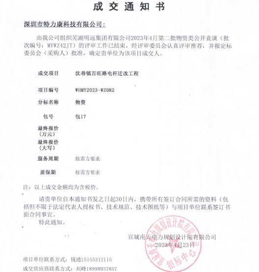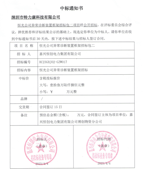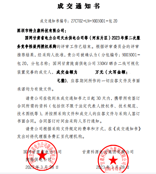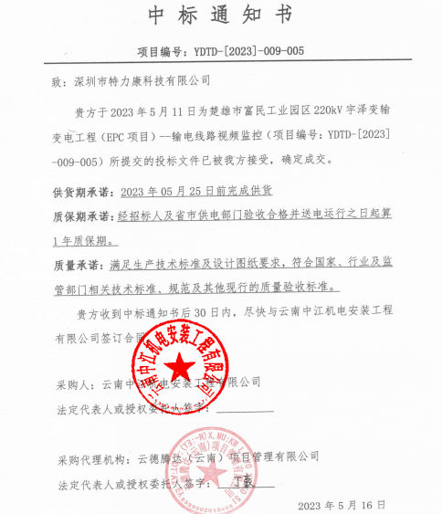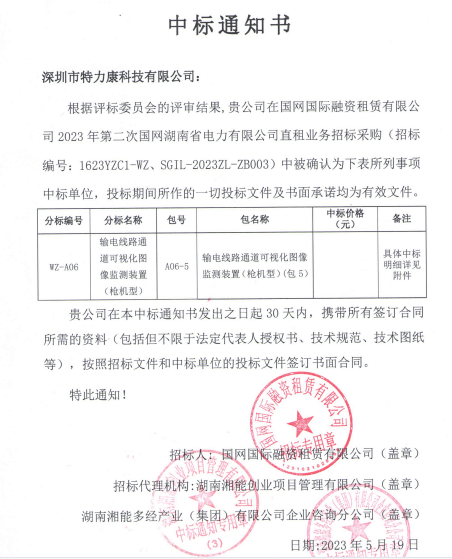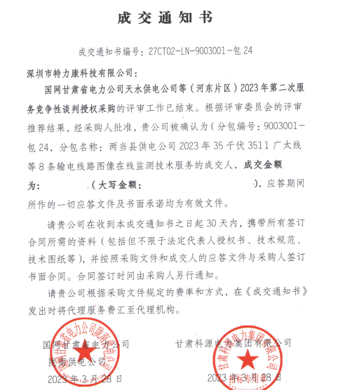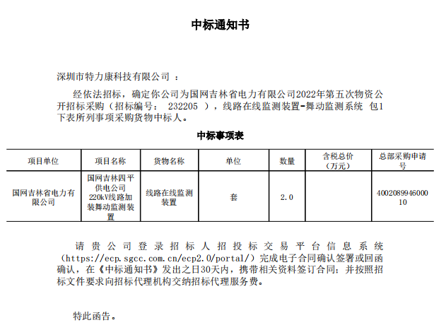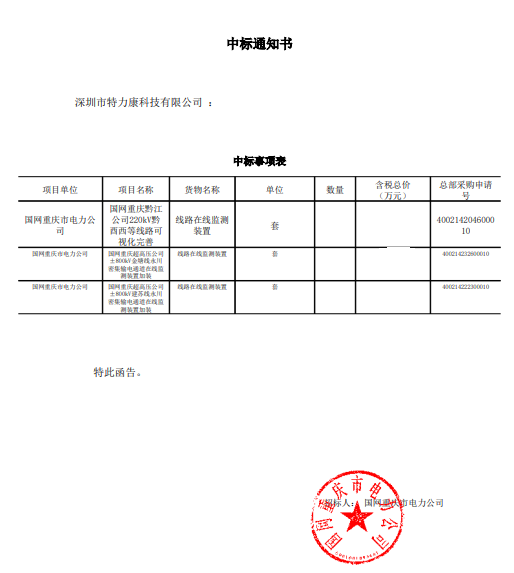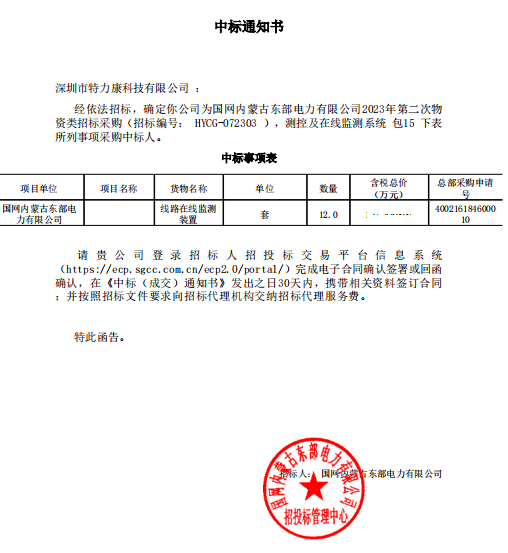 特力康中標國網(wǎng)黑龍江送變電工程公司的2024年度第18次物資類競爭性談判采購項目——慶陽驅(qū)鳥器物資框 特力康中標國網(wǎng)甘肅省電力公司省管產(chǎn)業(yè)單位2024年第五次物資競爭性談判授權(quán)采購項目 中標喜訊:深圳市特力康科技有限公司成功入圍許繼集團綜合能源公司輸電線路視頻在線監(jiān)測裝置模塊集采項目 中標喜訊:特力康成功中標國網(wǎng)重慶市電力公司渝中一片區(qū)項目 特力康成功中標國網(wǎng)天津市電力公司2024年第二次?物?資招標項目 特力康中標國網(wǎng)安徽省電力有限公司蕪湖供電公司2024年3月非物質(zhì)采購項目 貴州電力裝特力康電網(wǎng)架空線路覆冰監(jiān)測系統(tǒng),精準防冰保電網(wǎng)過冬? 百套落地山西電網(wǎng)!特力康輕量化輸電架空線路監(jiān)拍裝置,筑牢輸電安全網(wǎng) 破解采空區(qū)隱患:山西電力裝特力康通用型監(jiān)測裝置,守鐵塔穩(wěn)運行 四川電力用特力康架空輸電線路山火監(jiān)測裝置,筑牢林區(qū)輸電 “防火墻”? 遼寧電力啟用特力康多視角監(jiān)拍裝置,全維度守護輸電安全? 破解黃土高原沉降難題:山西電力用特力康北斗裝置守桿塔安全? 山東電力啟用特力康動態(tài)版智能激光驅(qū)鳥器,動態(tài)防控守護變電站安全? 湖南超高壓電力啟用特力康球機 AI 監(jiān)測裝置,智能守護輸電通道安全? 廣西電力啟用特力康高壓電纜護層環(huán)流監(jiān)控設(shè)備,筑牢電纜安全防線? 寧夏配電線路安裝了我司防外破電子化智能警示牌